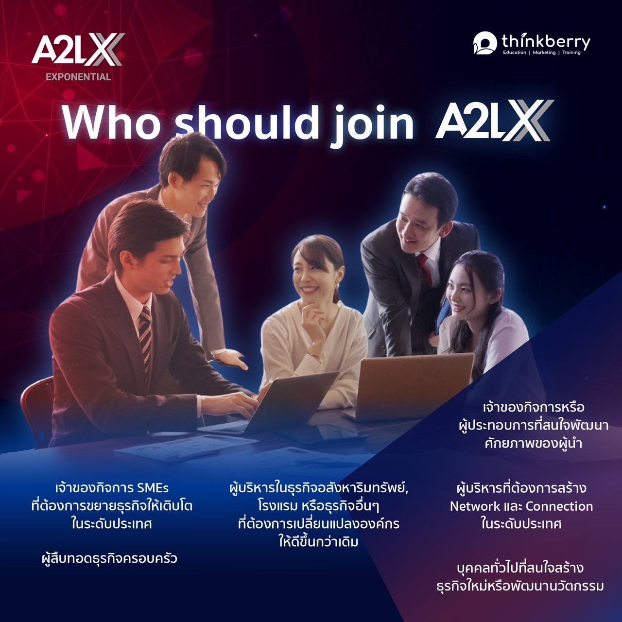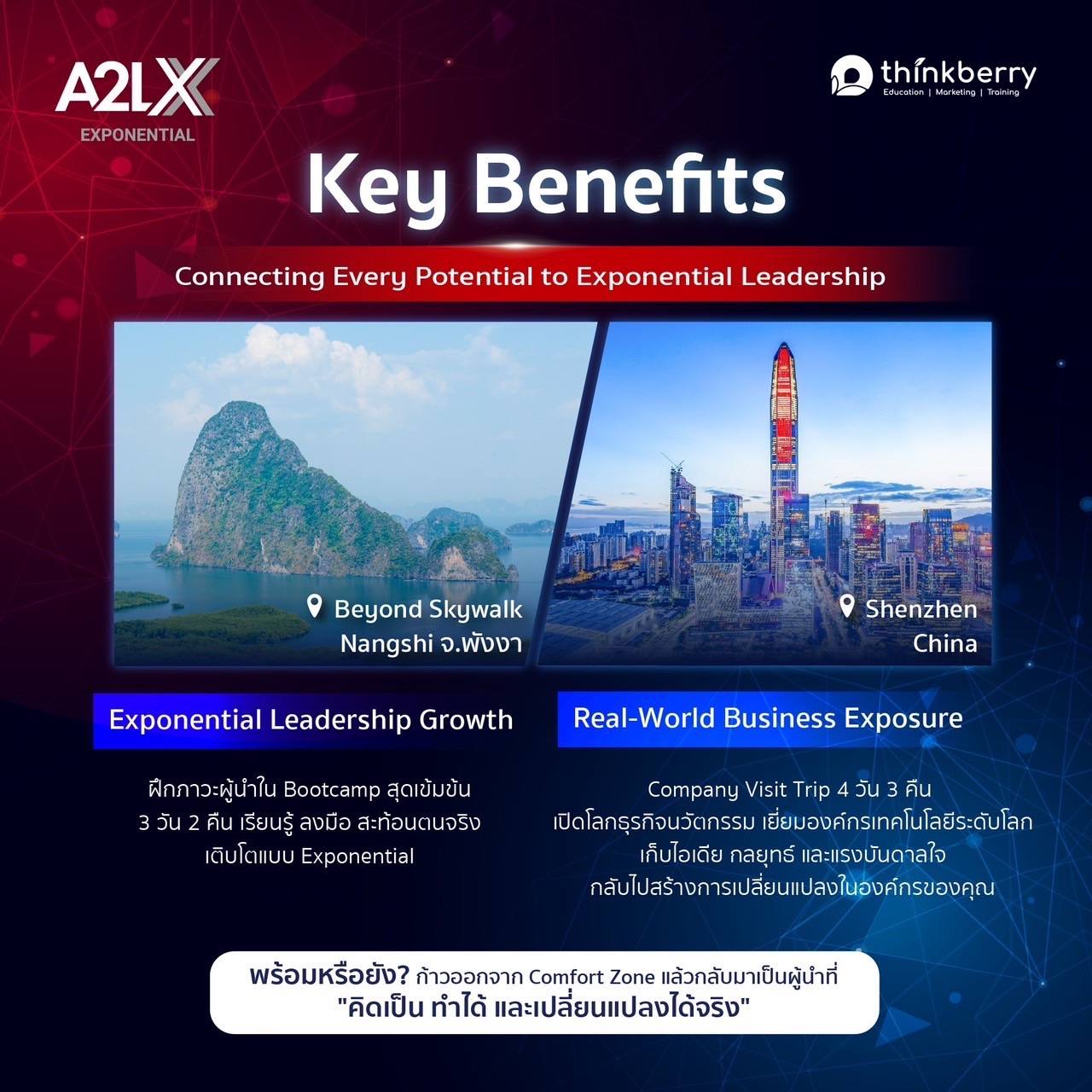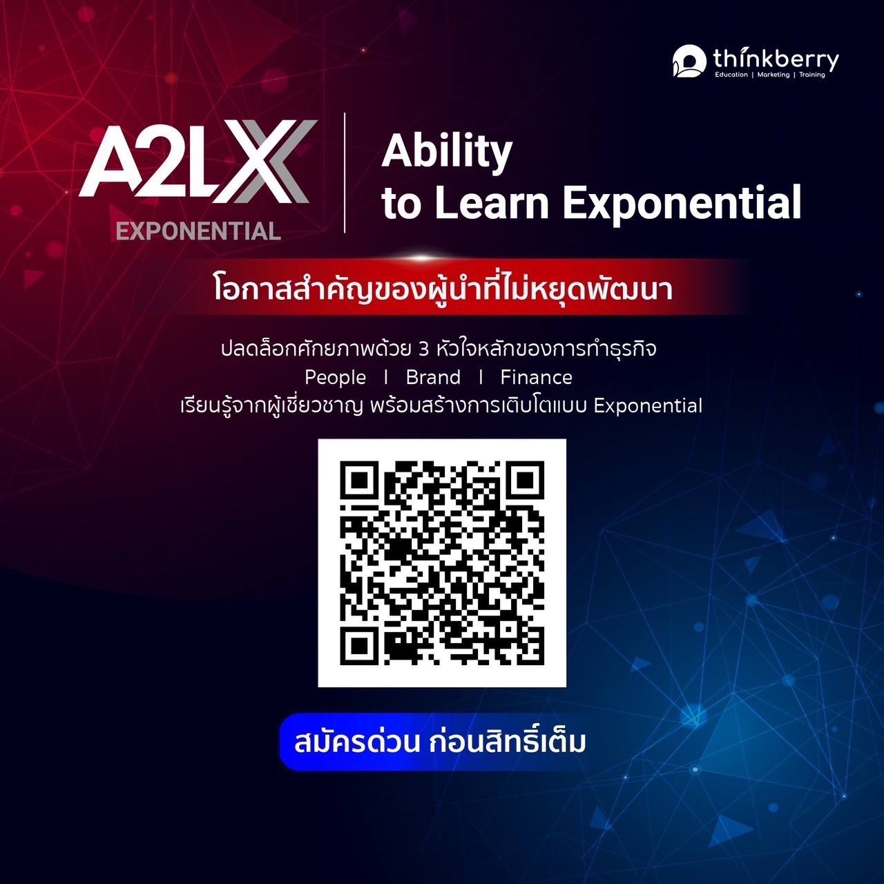 𝗔𝟮𝗟 𝗫 – 𝐀𝐛𝐢𝐥𝐢𝐭𝐲 𝐭𝐨 𝐋𝐞𝐚𝐫𝐧 𝐄𝐱𝐩𝐨𝐧𝐞𝐧𝐭𝐢𝐚𝐥 เราไม่ได้แค่ให้แรงบันดาลใจแต่คัดสรร “Framework” ที่คุณสามารถนำไปใช้งานได้จริงและเรียนจริงกับผู้เชี่ยวชาญระดับประเทศ พร้อมทริปดูงาน 4 วัน 3 คืน ณ เซิ่นเจิ้น , ประเทศจีน และ Leadership Bootcamp 3 วัน 2 คืน ณ จังหวัดพังงา